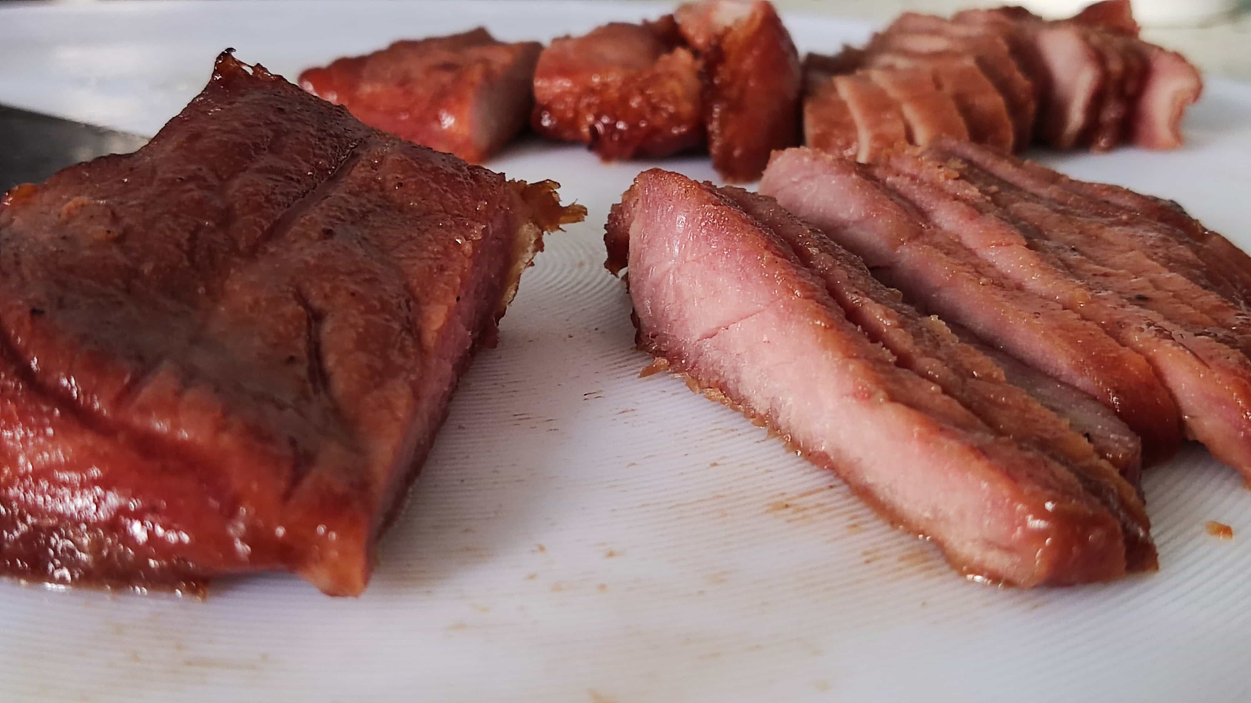 我一直都很想尝试美国那种大块的 smoked brisket(原因请去看 少年谢尔顿/论烟烤牛肉的魅力),在切猪肉的过程中,看着刀切开焦红的表皮,露出里面香嫩的肉时,我突然有种梦想成真的感觉😭。我爱吃肉!