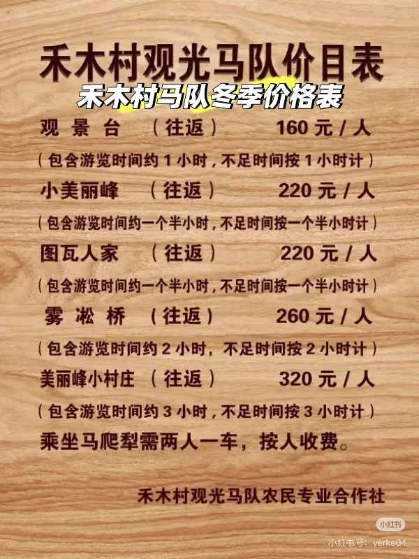 - 骑马体验可以参考:小红书:禾木村骑马走美丽峰喝奶茶需二次收费,被迫,博主表示雪景骑马体验不错,但是到山顶冻的不行,进屋子吃东西要收30块钱(其实也还好)。还有另一个博主的:小红书:5.3禾木今天也太美了叭!!