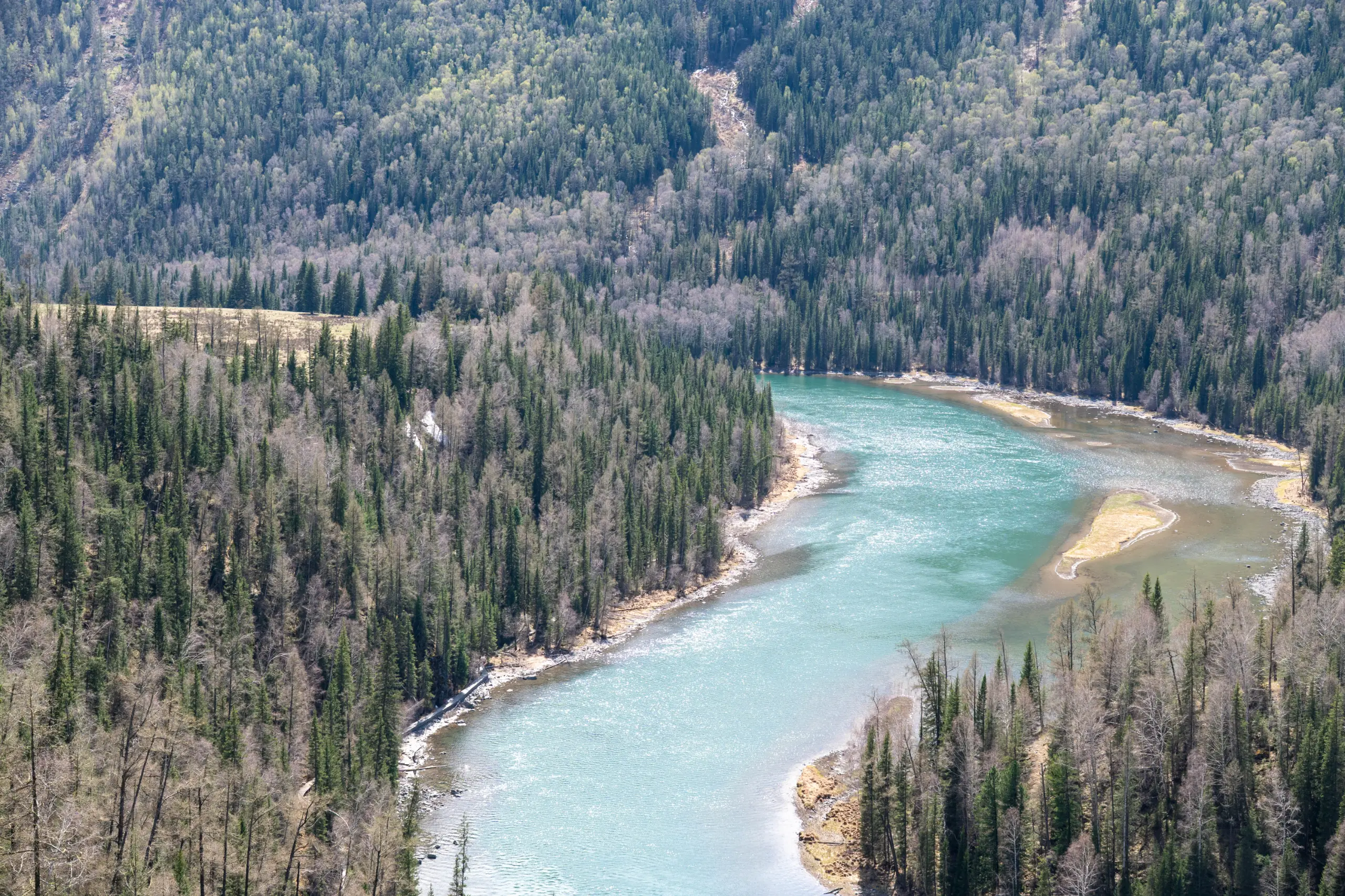 我们在民宿吃了早餐,又吃了包尔萨克。老板还送了一碗鸡蛋面。然后我们就离开禾木去喀纳斯了。回去路上经过山坡时,山脚下的雪已经化完了。我们这个时节正处于雪化的阶段,张哥说等雪化完,山就不好看了。我们到喀纳斯后转乘大巴,一路上都是雪水融化形成的小溪。
